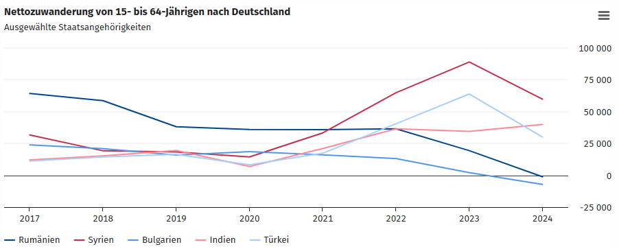Auch 2022 und 2024 gehörten diese fünf Gruppen zu den größten Zuwanderungsgruppen – trotz eines Rückgangs von Menschen aus Rumänien und Bulgarien.
