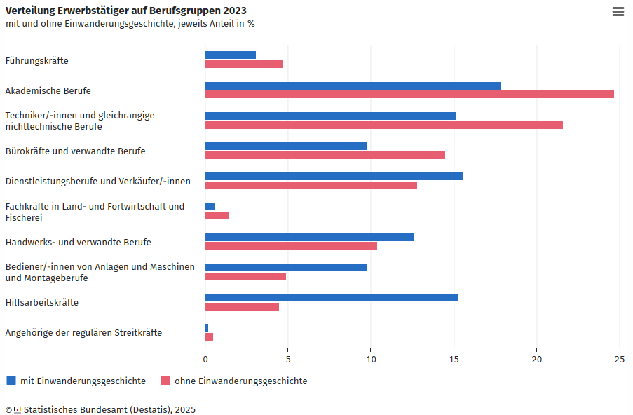 Menschen mit und ohne Einwanderungsgeschichte arbeiten in vielen verschiedenen Berufen. Das sieht man auch in der Grafik. Personen mit Migrationshintergrund arbeiten häufiger in einfachen Berufen. Sie haben seltener eine Führungsposition oder einen akademischen Grad (z.B. Doktor). Sie arbeiten überdurchschnittlich oft in Branchen wie Gastronomie, Bauwesen, Reinigung, Lieferdiensten, Landwirtschaft oder im Unterhaltungssektor.