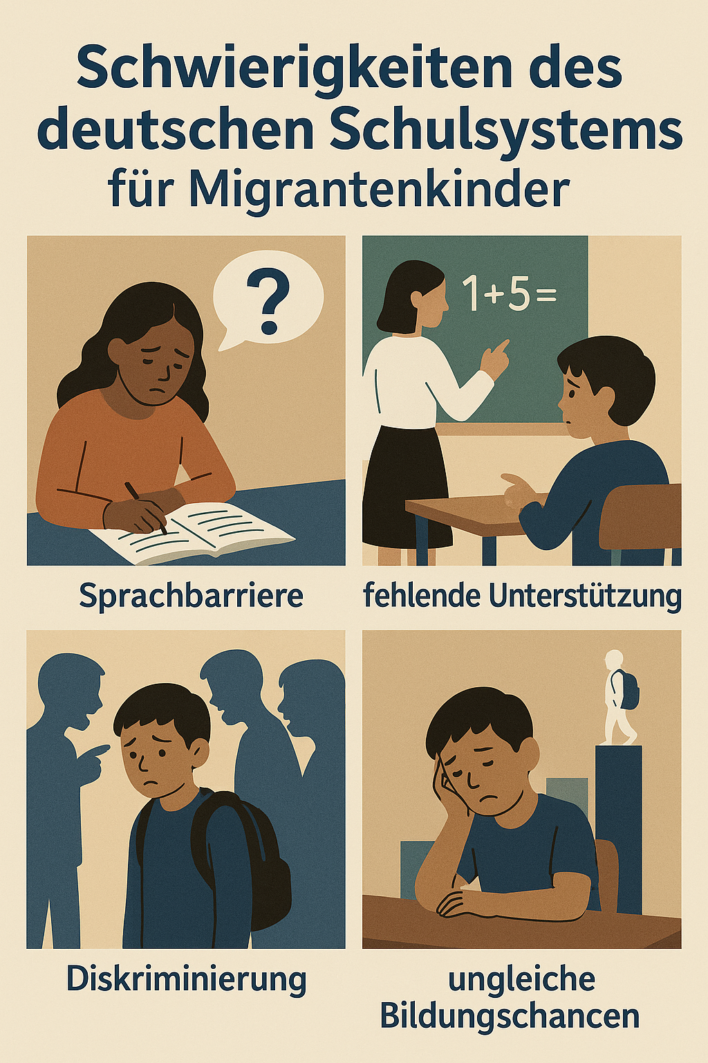 Das größte Problem ist meist die Sprache. Viele Kinder sprechen zu Hause ihre Muttersprache und lernen Deutsch erst richtig in der Schule. Am Anfang verstehen sie den Unterricht nur teilweise. Wenn Lehrkräfte schnell sprechen oder viele Fachbegriffe benutzen, fühlen sich die Kinder unsicher. Manche trauen sich nicht, Fragen zu stellen, weil sie Angst haben, Fehler zu machen. Das kann dazu führen, dass sie leiser werden und sich zurückziehen.